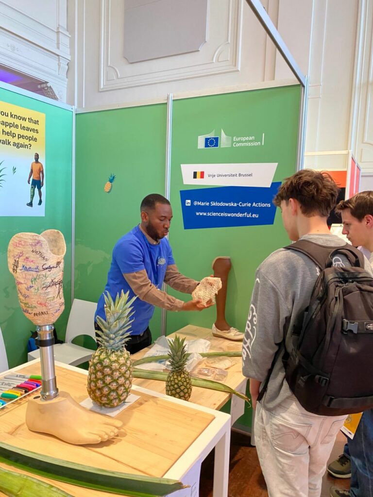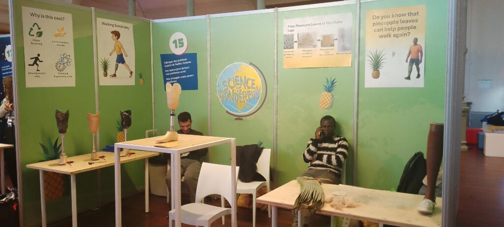 At his booth, visitors had the chance to discover the Pine-Prosthesis up close. They could see it, touch it, and learn about the remarkable idea behind it: how pineapple leaf fibers can be transformed into a sustainable innovation such as a prosthesis. Many were genuinely amazed by the concept, and several participants even had the special opportunity to write their names on the Pine-socket, making the experience even more personal and memorable.
